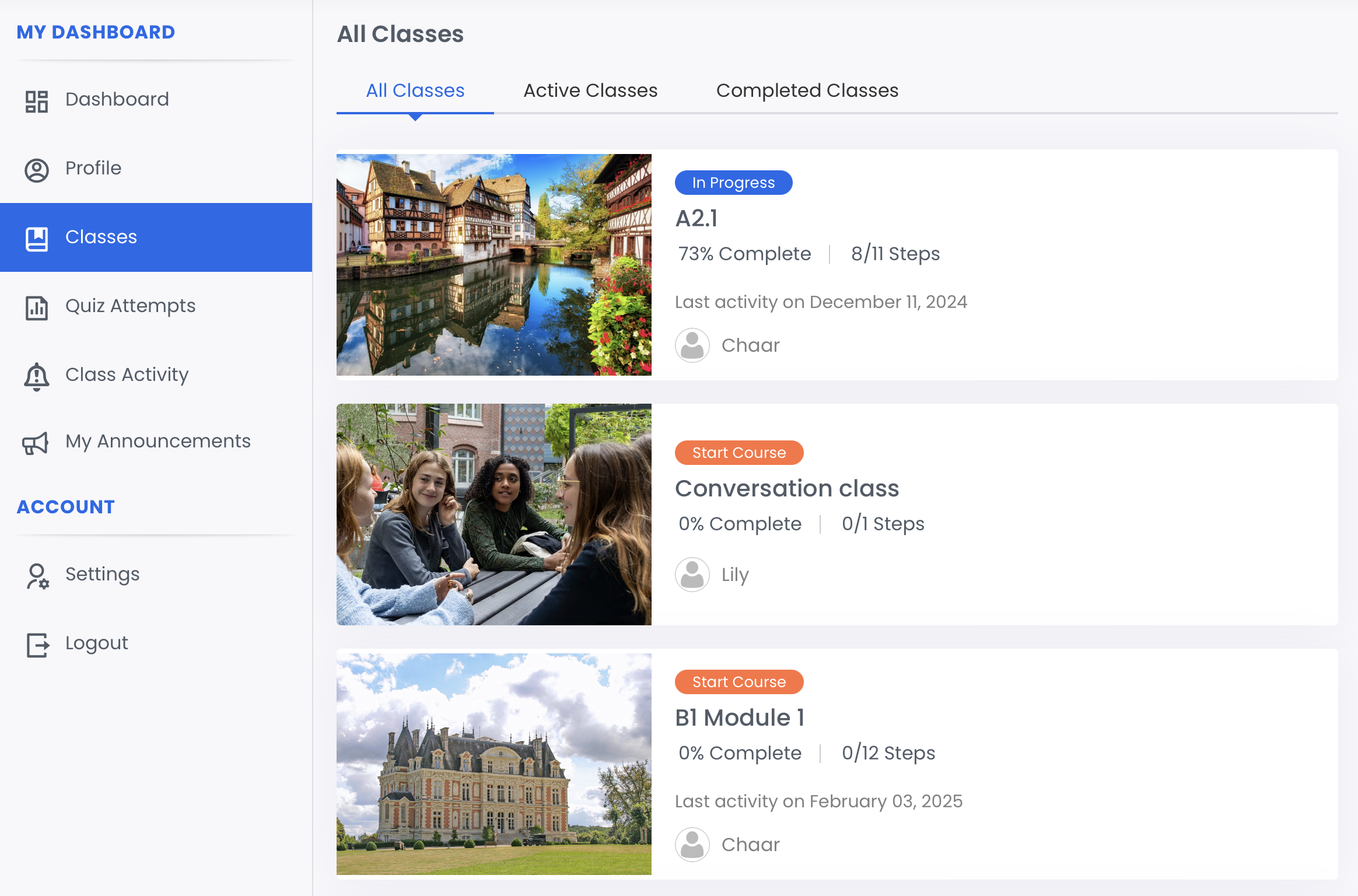 Speak French 90% of the course with your language coach, enjoy engaging lessons with regular testing to ensure steady progress.